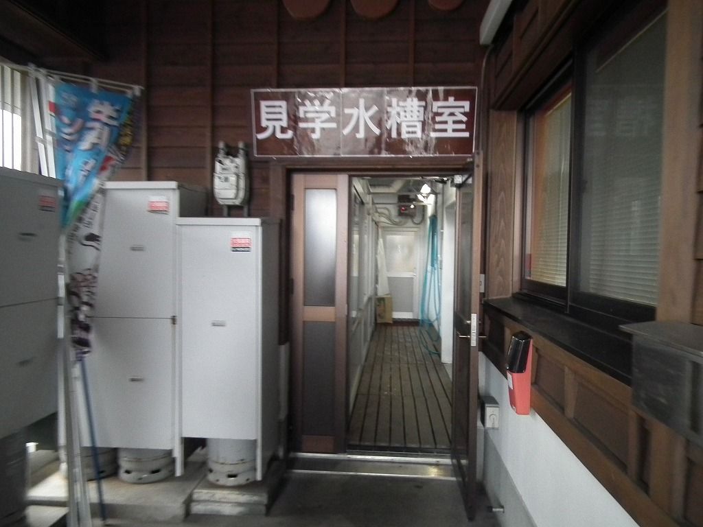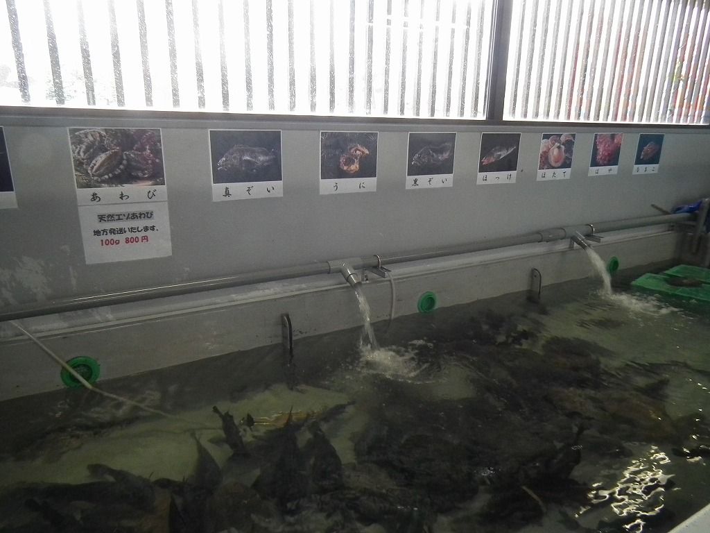 また、裏には見学水槽室があり、近海で取れる魚やアワビやウ二が元気良く泳ぐ姿がみれます。